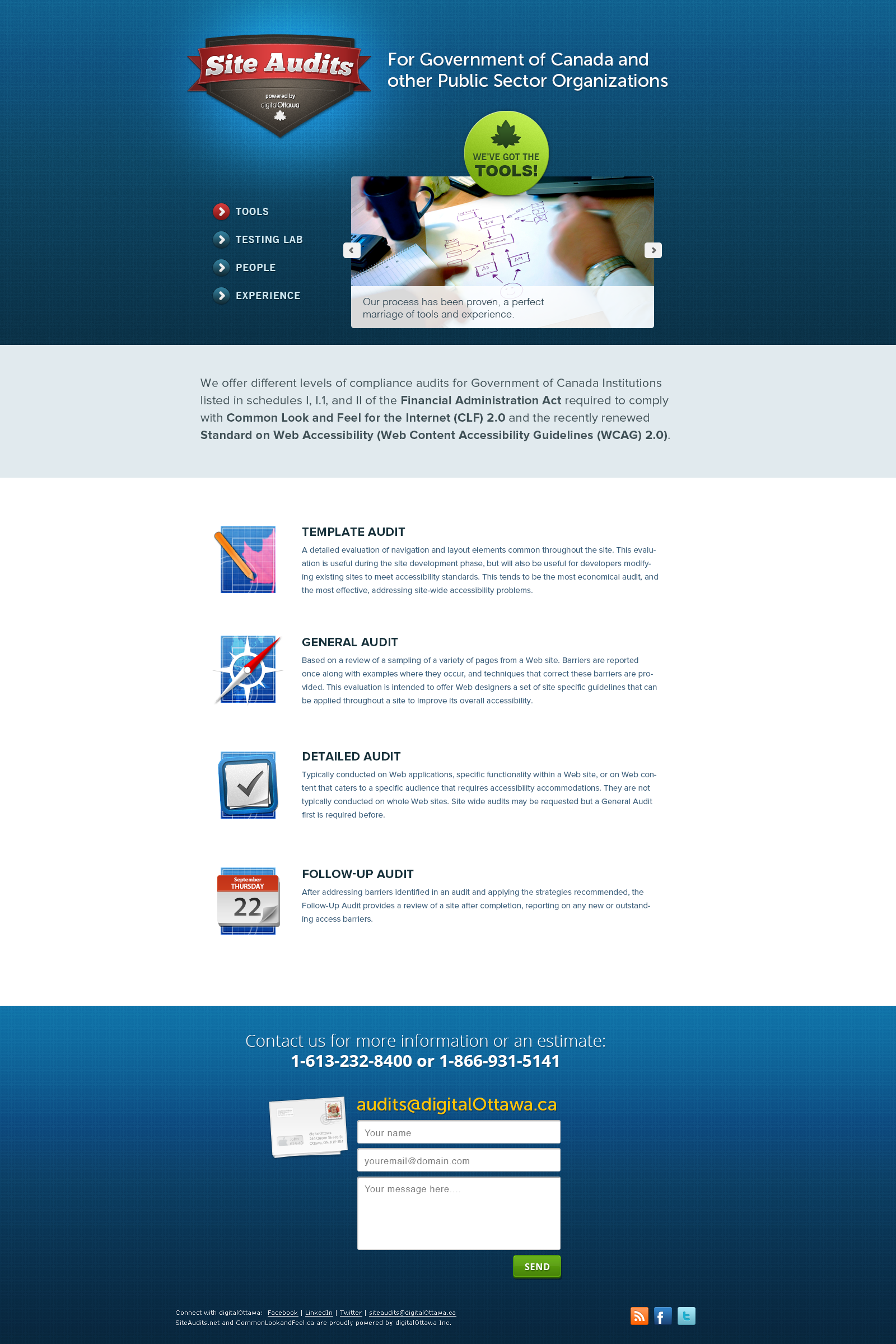 Site Audits offers different levels of compliance audits for Government of Canada Institutions listed in the schedules I, I.1 and II of the Financial Administration Act required to comply with the Common Look and Feel 2.0 and the WCAG 2.0.